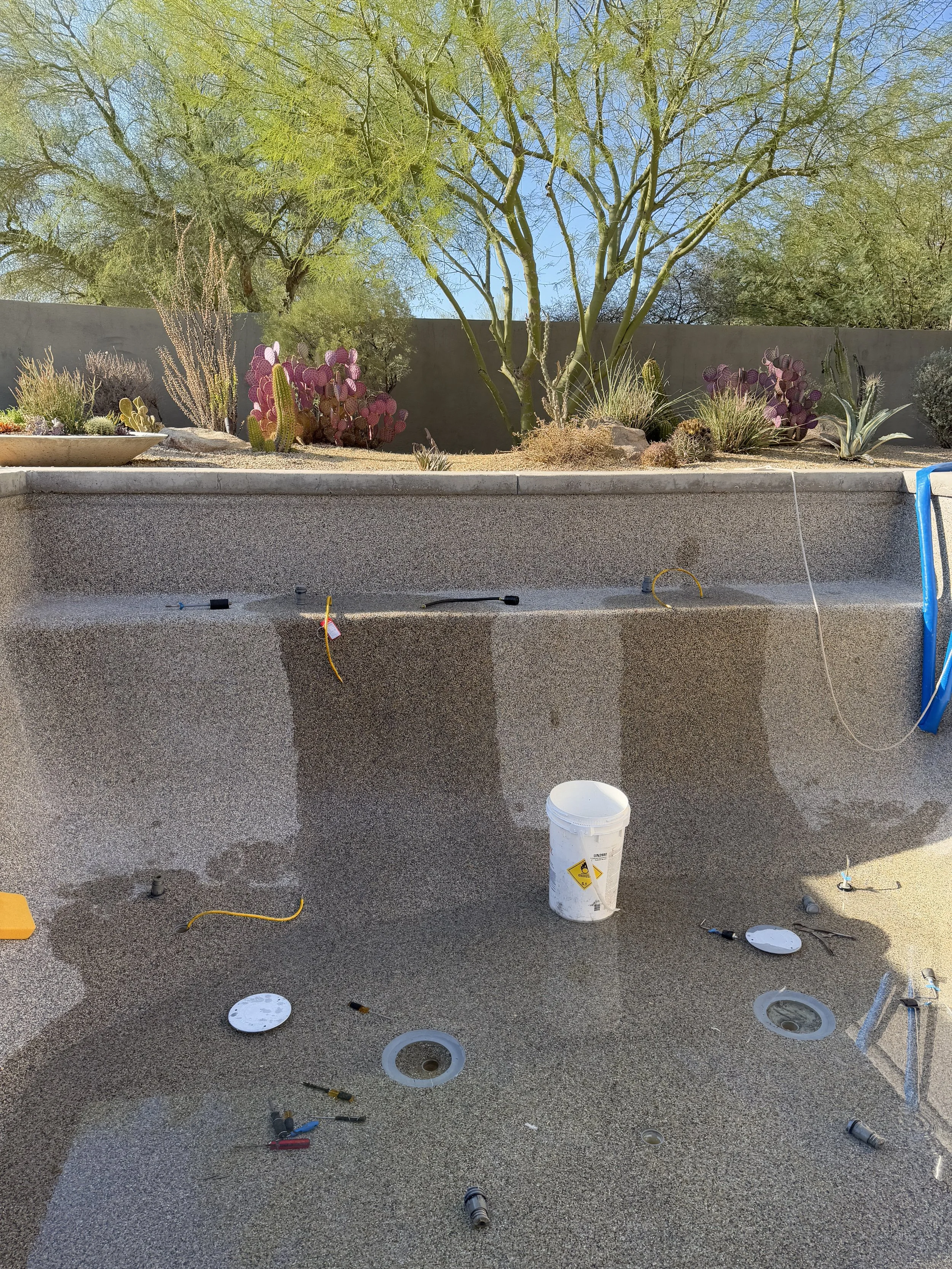 Suppose the leak is detected under concrete/pavers/travertine, in such cases we carefully remove anything not in a fixed position. If under concrete we have the necessary tools to cut and demo out concrete to access the leak. In this example we saw cut and demoed out a square to access a leaking pipe, while also not damaging the skimmer that was to the side.