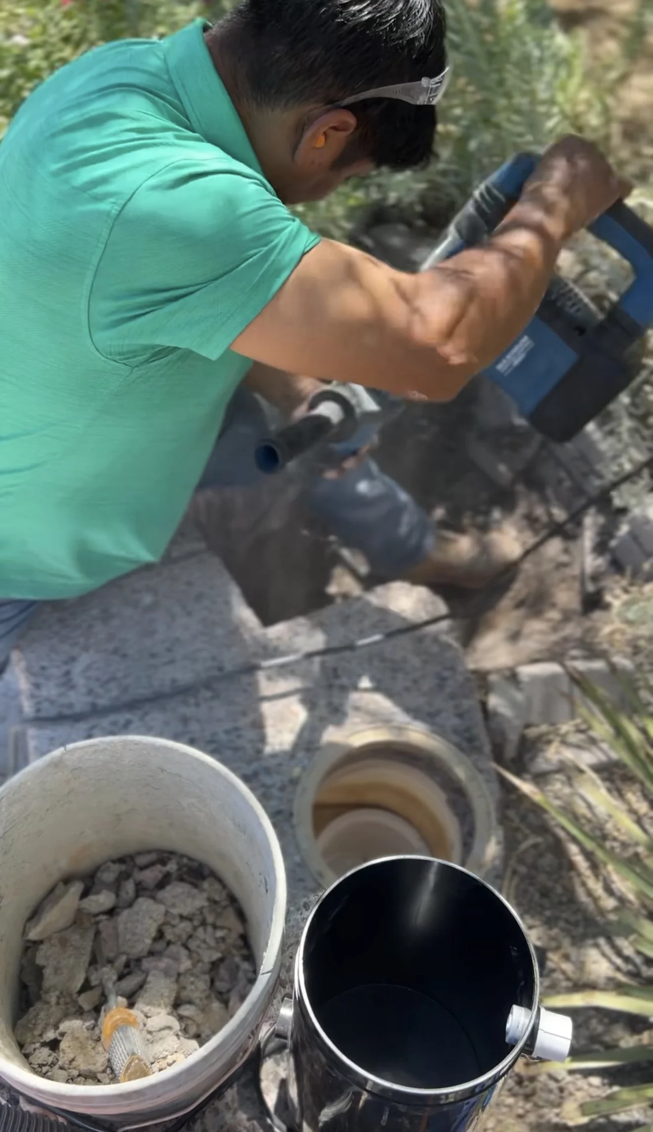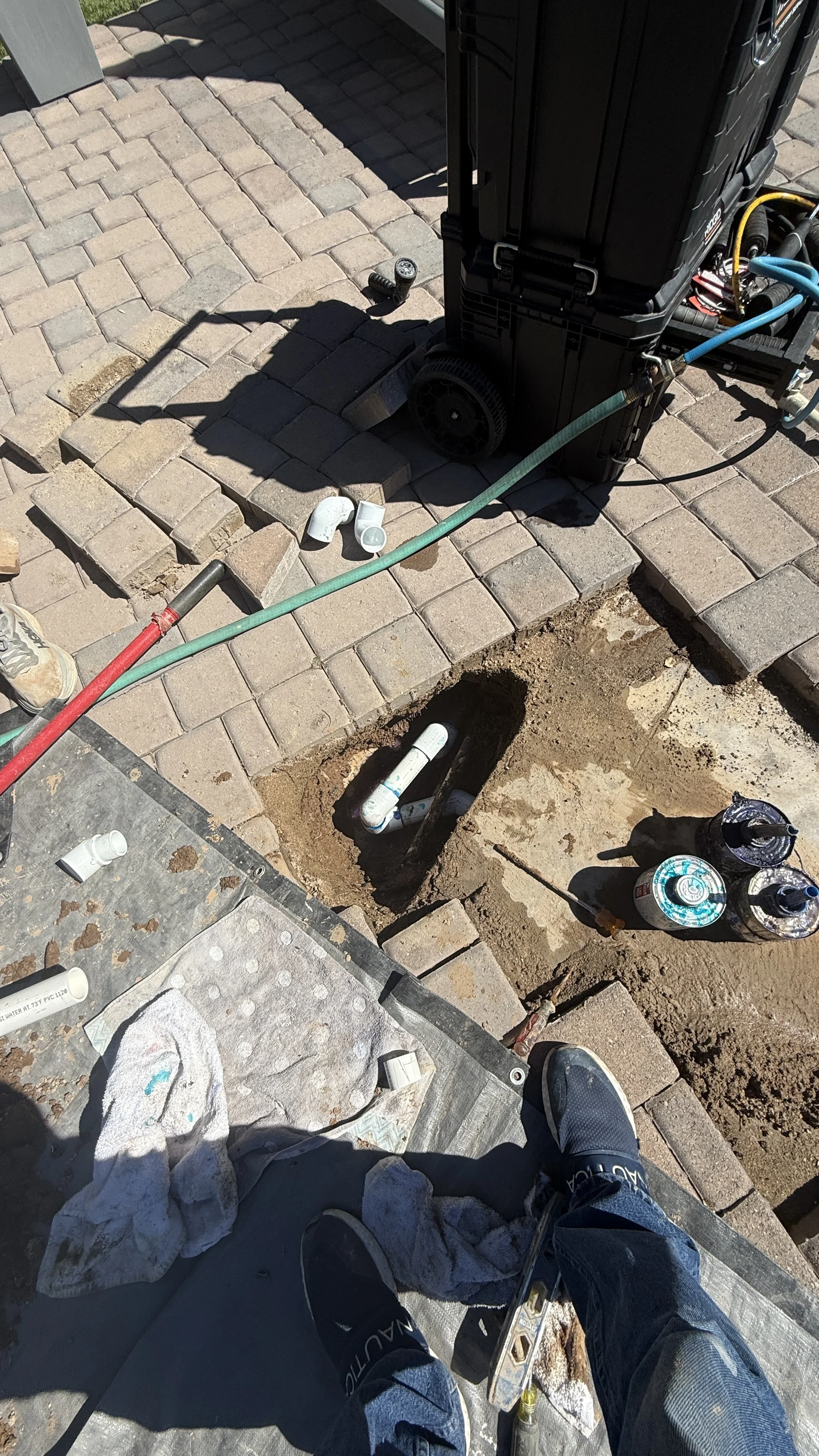 Once uncovered we can begin with the actual repair. Sometimes even after you demo and uncover you may find that the leaking pipe is below other pipes. In this case the leak was under pavers. We repair the leak using heavy duty blue glue and redid the pressure test to ensure the leak we fixed was in fact the leak we were looking for.