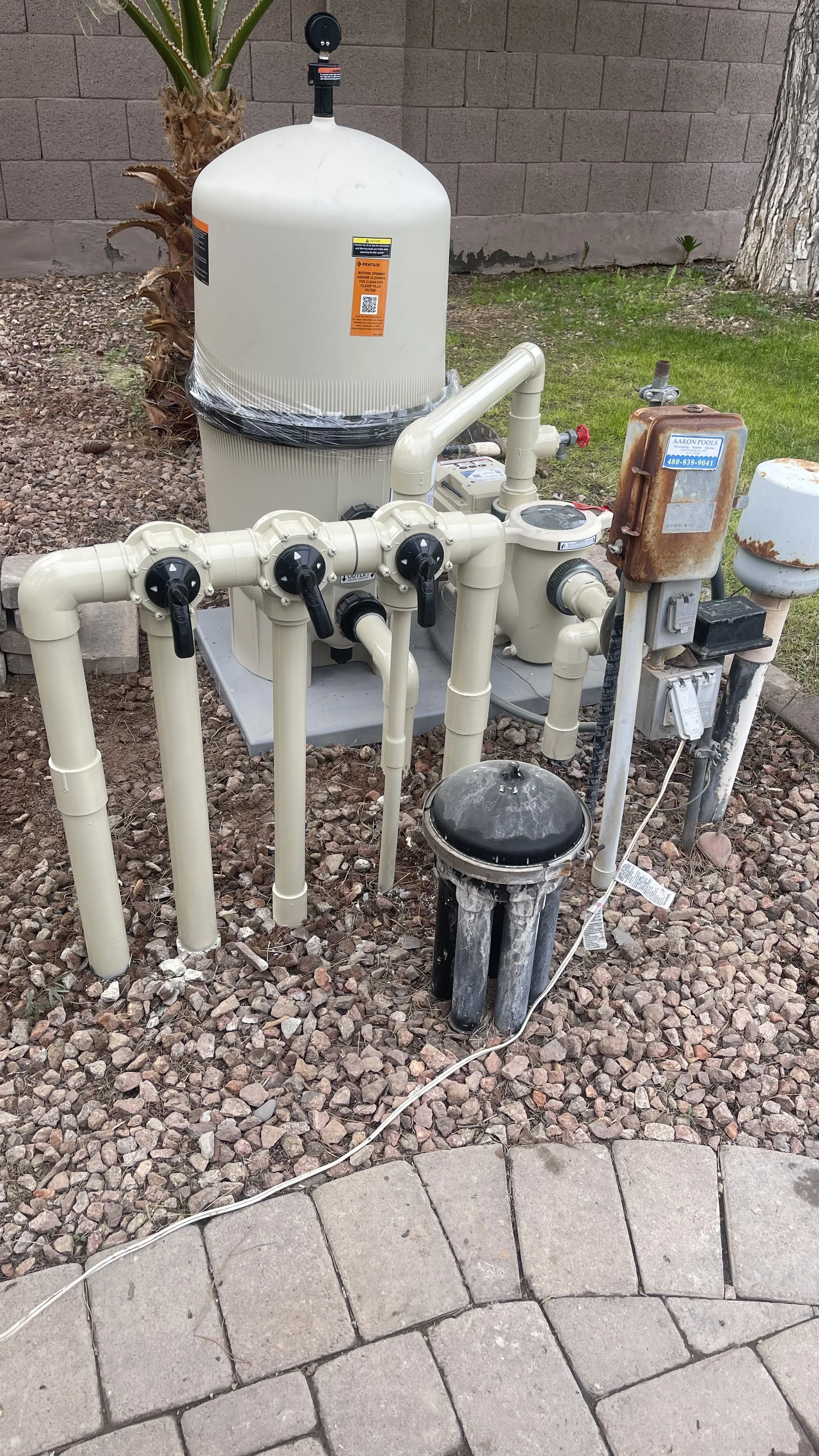 Not covering your equipment is one of the biggest mistakes. Giving it even a small shade will save you thousands. In the case that you didn’t properly shade your equipment or maybe you just want a new equipment set, we got you covered. We can eliminate lines, add lines, add a heater if you prefer hotter water, we can install a new pump and filter. New valves? We got you! In this here equipment set we cancelled the pop-up heads and were asked to leave the water valve as is and give the rest of the equipment a new makeover.